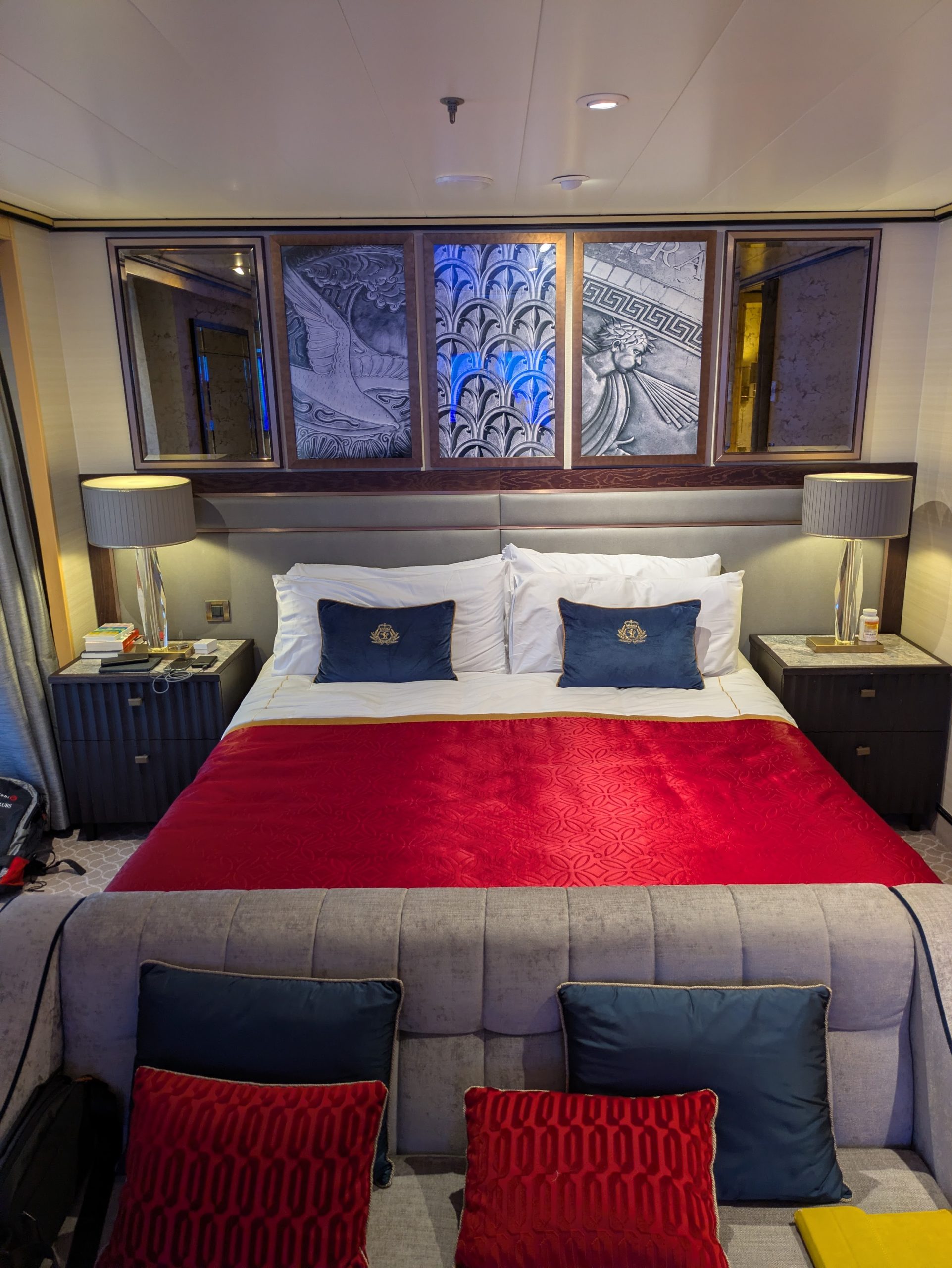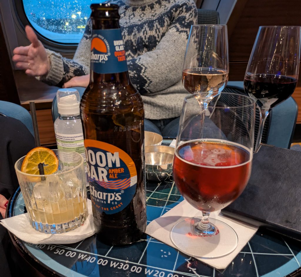 Once past check-in we had a bit of a wait for the ship to become ready, 40 minute was promised over the PA, but they called the carded Queens Grill passengers (Q1 and Q2 staterooms) as they get a personal escort and before long we we called. After a quick security check we were through and on board the ship. The luggage hadn’t arrived at the stateroom before us so we quickly unpacked the hand luggage, messed up the safe locking requiring a visit and a reset, and headed down to our Muster station to get our cards scanned. After that it was time to find our table for lunch. We had requested a table for eight which Osman, the Maitre’d, provided for us. We’re usually the only ones at lunch, people have often had a long journey so give lunch a miss, but we had 4 table mates for lunch and very pleasant they seemed too. The afternoon was spent unpacking, visiting the concierge desk to book a Future Cruise Bookings slot, as we need to see if we can change next year’s Caribbean cruise and checking that Jane’s Gala Night hairdo is booked in at the Spa as it’s not showing up on My Voyage. It was booked for 4 pm and we have a 10:40 cruise booking appointment so all is good. After that it was time for the Commodore Club where we’d arranged to meet up with friends who had been witnesses at our February wedding. Jane is still not happy with the bar menus, no selection and you are at the mercy of the waiters when trying to find a cocktail to drink. The signature QEII is no longer available and this cannot be because they don’t have the ingredients